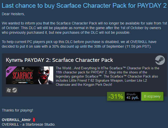 ыС 22 сентября и до 1 октября 9:59 по мск будет действовать скидка 30% на дополнение Scarface Character Pack.