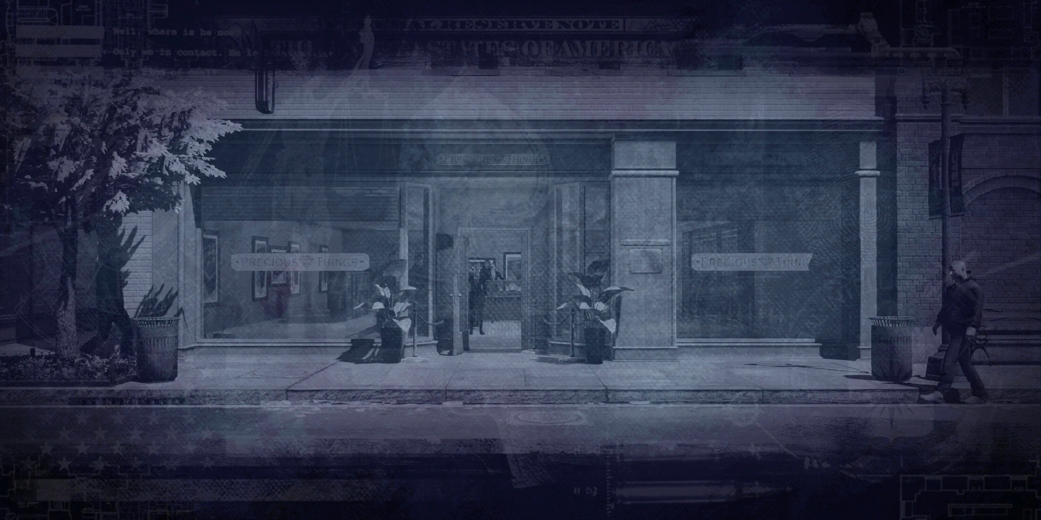 Тиара находится в одном из двух сейфов, которые находятся в кабинетах в задней части магазина, по одному на кабинет. Перед главным входом стоит металлодетектор, переключатель питания от него висит на стене со стороны переулков. Охранники (от одного до трёх) патрулируют переулки слева, справа и за зданием. В правом от входа кабинете обязательно находится один из охранников (рядом с ним находится станция видеонаблюдения), в левом же — решает случайность. Торговый зал патрулирует один охранник, который может заглянуть и в кабинеты. Количество гражданских в левом кабинете случайно (1-5), также из главного зала может зайти ещё несколько.