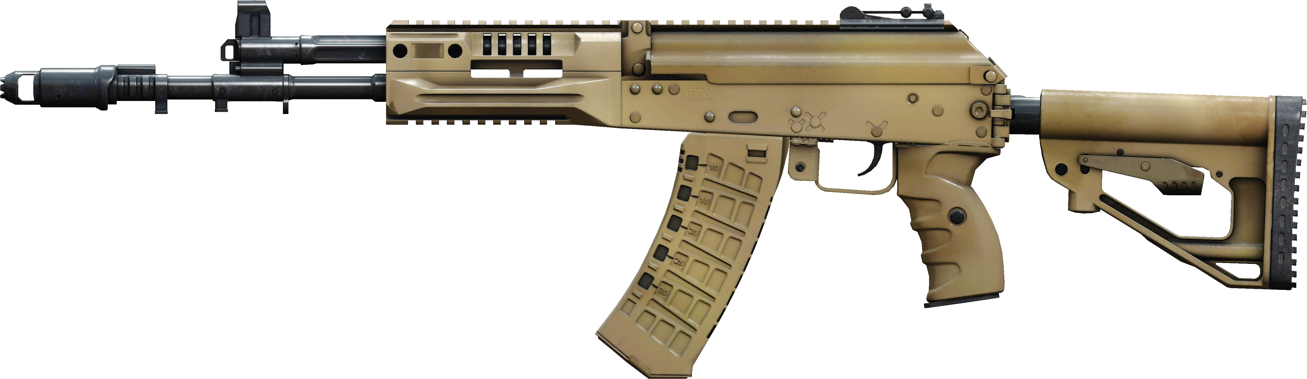 - На левой стороне ствольной коробки нанесен соответствующий автомату индекс ГРАУ 6П70. Под ним указан используемый боеприпас — 5,45х39 мм.