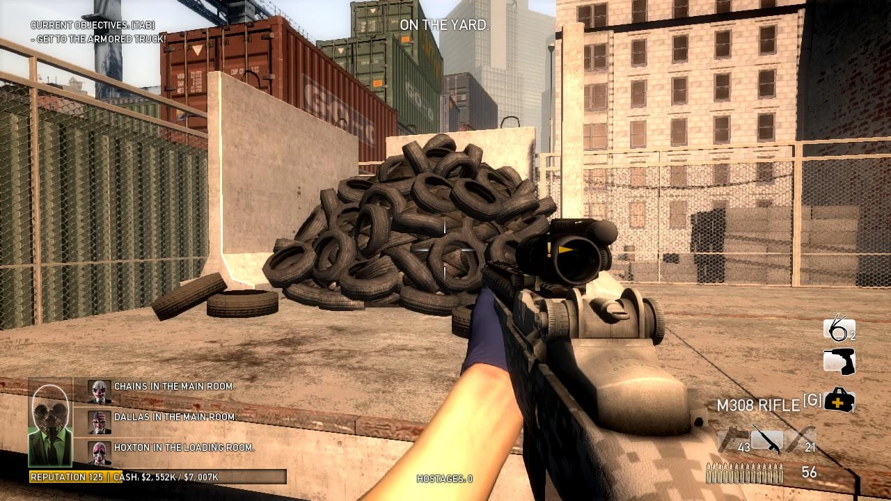Доберитесь до грузовика[] После атаки на конвой бегите вниз. По пути вы можете обратить внимание на дыру в крыше скотобойни. Бегите вниз по лестнице. Перед тем как заходить внутрь, можете уничтожить камеру наблюдения над дверью. Как только вы окажетесь внутри, вы увидите двух охранников, которых можете убить или взять в заложники. Посмотрите наверх и обратите внимание, что транспорт застрял. Вам нужно выстрелить по проводам, чтобы грузовик упал, а после поместить заряд C4 на дверь (если грузовик висит задом к земле, вы можете не трогать провода и немедленно установить заряд C4, запрыгнув на стол, и тогда сейф выпадет с пятью пачками с деньгами). Если грузовик висит передом к земле, иногда Бульдозер может выпасть из багажника вместе с сейфом после взрыва С4, но упадет на пол и довольно долго будет пытаться подняться, так что у команды будет шанс убрать его до того, как он встанет. Просверлите сейф[]После установки дрели у вас есть время, чтобы уничтожить камеры в здании скотобойни и найти хорошую оборонительную позицию. Когда Бэйн предупредит вас о Murkywater у складских ворот, направляйтесь туда и попытайтесь убить их, пока они все еще ползают под ними. Когда вам нужно перезапустить дрель в середине штурма, можно подбежать к ближайшей свиной туше (если она есть) и использовать ее в качестве прикрытия. Возьмите золото[] После того, как сверление закончилось, положите золото в сумки и перенесите их через заднюю дверь на склад контейнеров. Как только вы положите первую сумку с золотом, будет активирована следующая цель. Каждая сумка золота стоит 250K, поэтому, если вы хотите 1000R, рекомендуется иметь полную команду, чтобы забрать все сумки сразу. Иначе придется возвращаться за дополнительной сумкой. Запустите дымовую завесу[] Теперь, когда золото на месте, следует запустить дымовую завесу, так как у полицейских имеется вертолет в небе, поэтому вам (или вашему товарищу) нужно взять канистру с бензином и положить ее на покрышки. Вам нужно будет подождать некоторое время до тех пор, пока вертолет не улетит, и Бэйн не свяжется с вами, чтобы дать команду об установке новой ловушки. Чтобы установить ловушку, вам (или вашему товарищу) нужно взять другую канистру и поместить ее в контейнер рядом с контейнером с золотом. Приготовьте ловушку[]В центре складской зоны находится панель управления. Взаимодействуйте с ней, а затем найдите себе хорошую оборонительную позицию, потому как спецназ будет наступать со всех сторон — они даже будут спускаются вниз с контейнеров, а некоторые стрелять сверху. Как только контейнер с золотом окажется на позиции (это занимает около 3 минут), вы должны будете переместить контейнер-ловушку. Используйте ту же панель управления, чтобы переместить контейнер, затем вернитесь на оборонительную позицию. Сбегите[]Бегите к помеченному контейнеру, но используйте другие контейнеры для укрытия. Если один из ваших товарищей по команде будет ранен на открытой местности, вам, вероятно, придется оставить его. Контейнер откроется, когда вы будете рядом, после чего вы можете просто продолжать идти вперед. Как только все ваши товарищи пройдут через контейнер с ловушкой, бензин загорится, и пламя помешает полиции пройти за вами. Если вы играете на сложности Overkill 145+, на пути к побегу может появиться 4 Бульдозера. Продолжайте бежать, и вы увидите груз