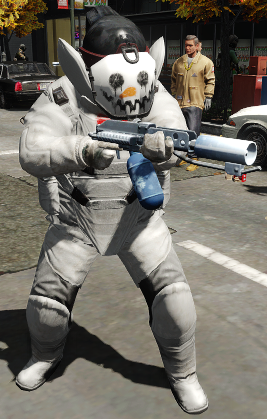 They wield the snowthrower, a modified Flamethrower Mk.1 painted blue that spits out blue flames. The snowthrower has a range of 15m, slightly longer than other flamethrowers, but does only a third of the damage. If a player is hit by the flames they will be slowed down by 5% each time, up to a maximum of 90% and will not be able to run. This effect lasts for 4 seconds and slowly fades away for another second.