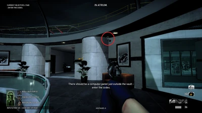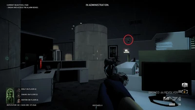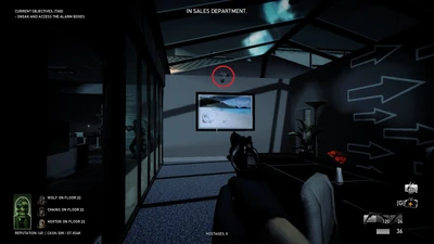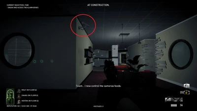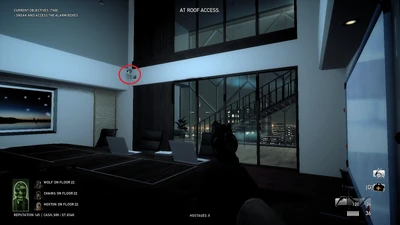 You and your team begin at one of the preset spawn points. There are three highlighted alarm boxes onto which you must plant a hacking device. It is recommended that you attempt to do this without being caught by any of the twelve patrol guards, because the more devices planted before being detected, the easier the heist will be.