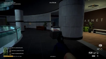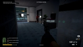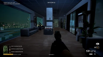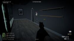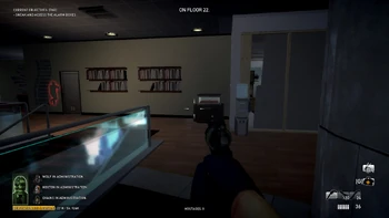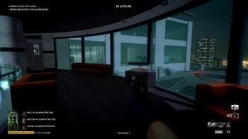 Civilians in the dance room can trigger the alarm if a player comes too close. Players cannot ascend the staircase next to the dance room while staying undetected, but can descend it only if they jump over the railing from the far side at the cost of some health. Players can also run around the dance room as long as they hug the exterior wall of the building.