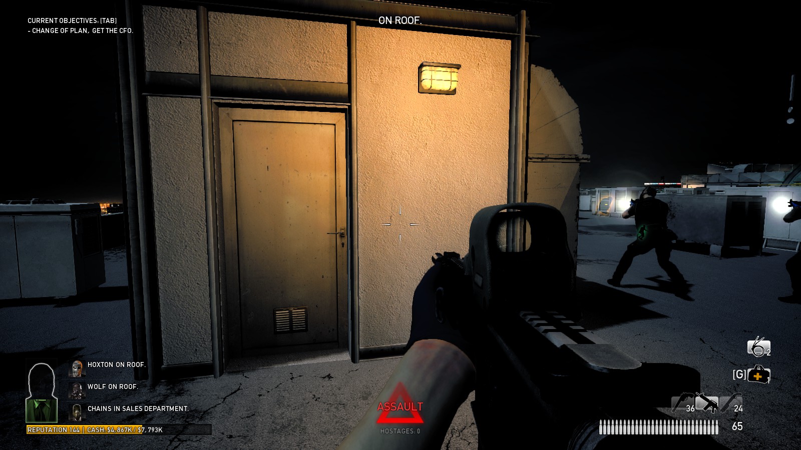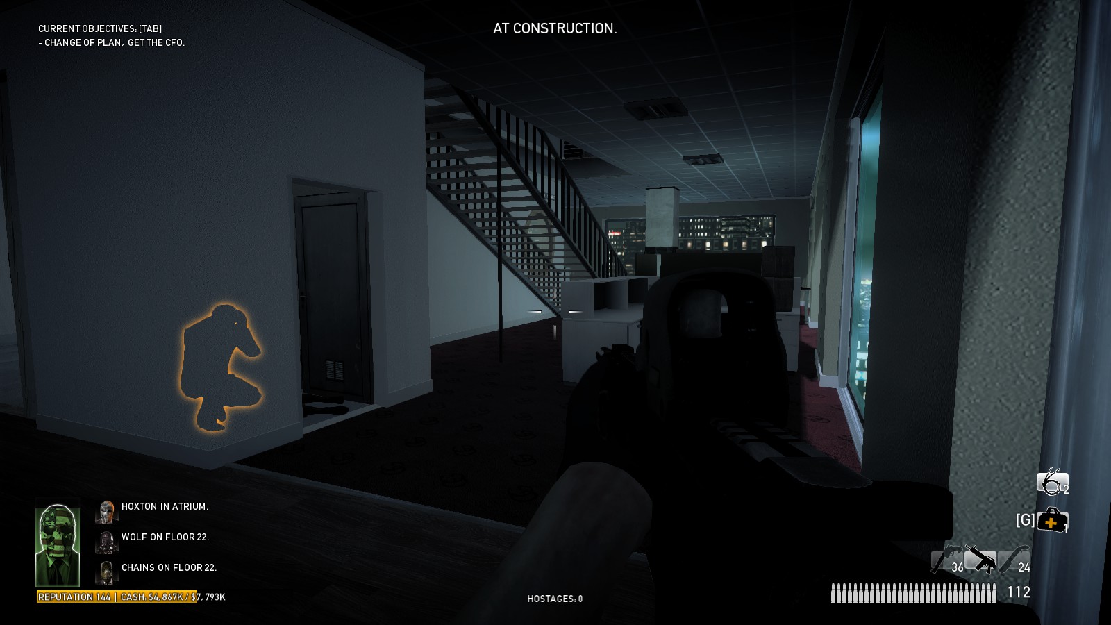 Search for the CFO, who is hiding either in a closet below the fitness center by the edge of the building, or next to the rectangular stairwell on the 23rd floor. You cannot find the CFO until you are given the objective to find him because the door he is behind remains closed until the objective is active. You must order him up to the roof, and onto the helipad. Once his orange outline disappears, the team may move to a more defensible location, such as the stairs next to the helipad. After some negotiation, the CFO will either give you the code, or refuse and force you to search for Garnet's son, Ralph. If he refuses, Bain kills him by dropping him from the chopper and into the glass dome above the atrium. The probability of the CFO providing the code is proportional to the amount of progress that was made while in the stealth phase.