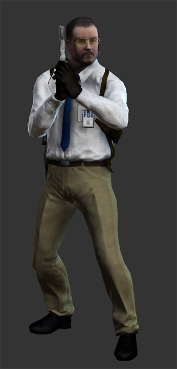 The Federal Bureau of Investigation agent is essentially a Blue SWAT armed with a Crosskill .45 pistol or B9-S, even having the same movement and health despite apparently being unarmoured. He is sent out as a part of a "hostage rescue team" between each assault wave, but ironically he can easily be taken hostage because of his low endurance. Despite being somewhat weak and only appearing in low numbers, FBI agents can be somewhat of a nuisance to players between assaults, though they are only armed with handguns, they are extremely accurate even when firing upon players from a distance.