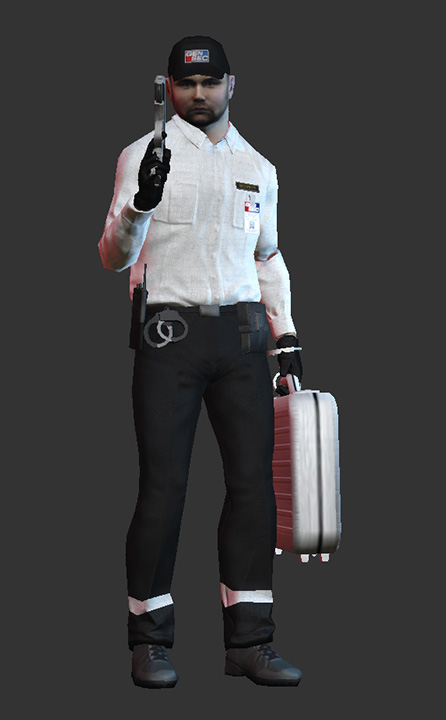 The Security Guard is the weakest enemy, usually armed only with a Crosskill .45 pistol. He has the lowest accuracy, lowest firepower and lowest endurance of all the enemies. Security guards appear in First World Bank as the bank guards, Green Bridge as the prison transport drivers, Slaughterhouse as the armored vehicle drivers and in No Mercy as the ICU guards.