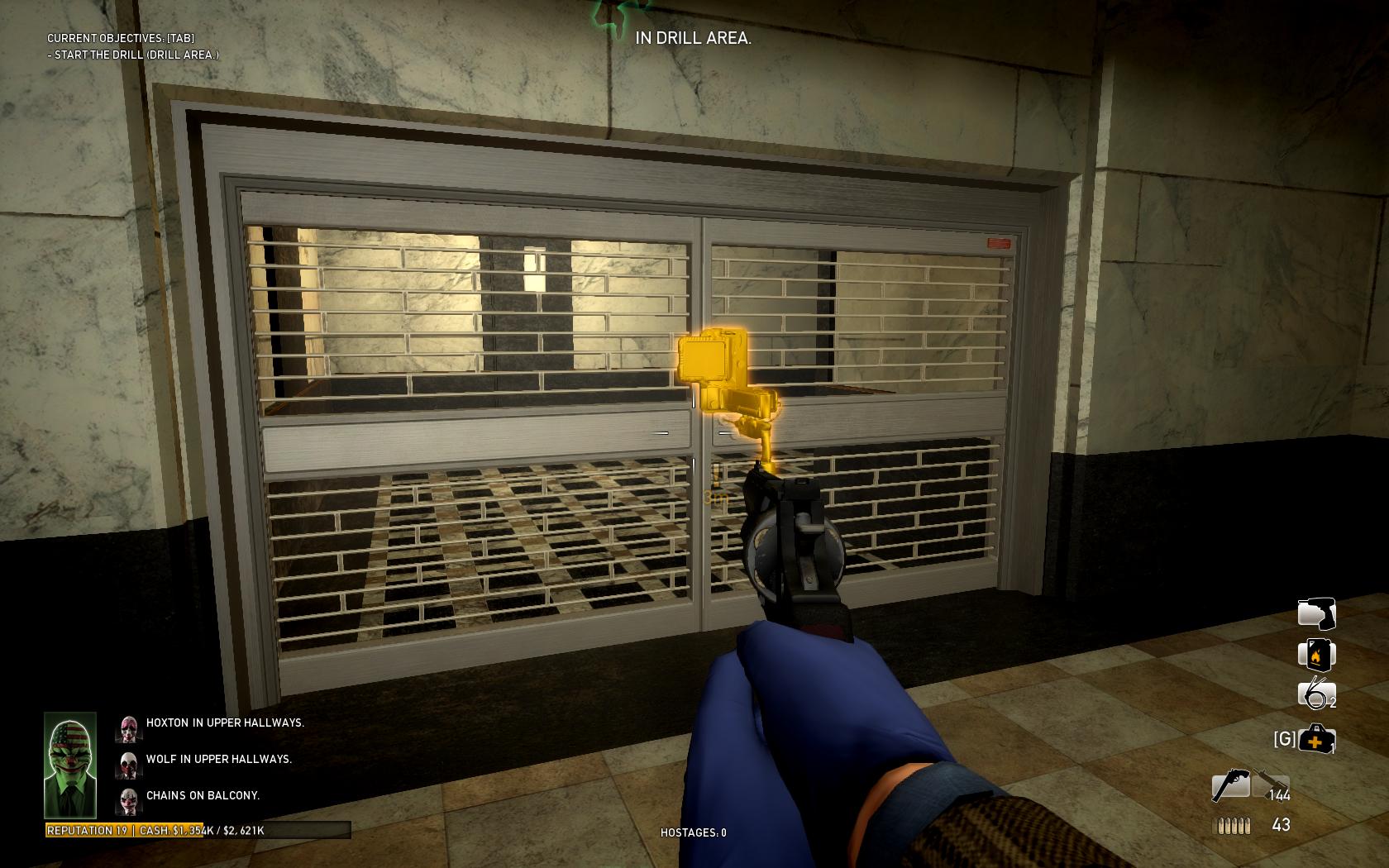 The drill takes 2000 seconds (33 minutes and 20 seconds) to finish, but never jams. Players are advised to find a highly defensible position during this time, such as the four niches at the vault hallway entrance. Players are also advised to keep track of time, as there is no cue when the drilling is complete. In the meantime, players can progress through the heist until the "Blow a hole in the wall" objective, to stop police from coming out of the elevator shafts. However, players should not breach the wall, as that would activate the escape timer and essentially abort the Overdrill run.