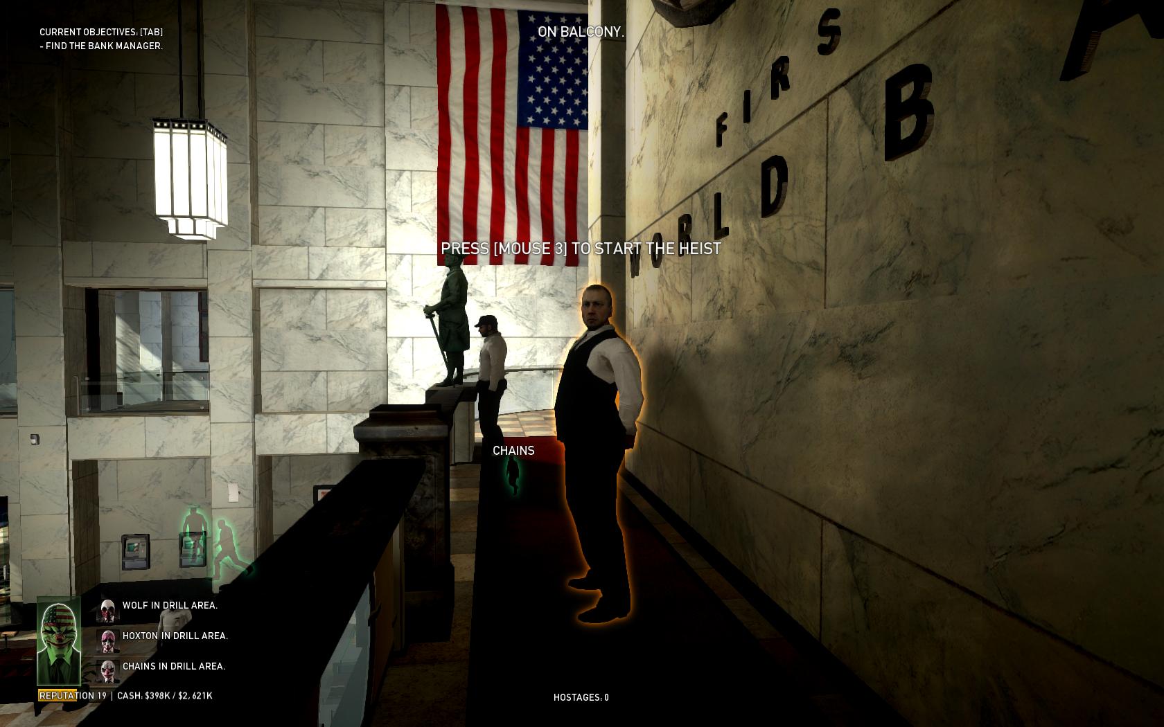 The heist requires the team to go in, take the server room key from the manager, take a drill and some thermite from the server room, drill the gates to the vault, melt the floor above the vault, grab the cash and escape.