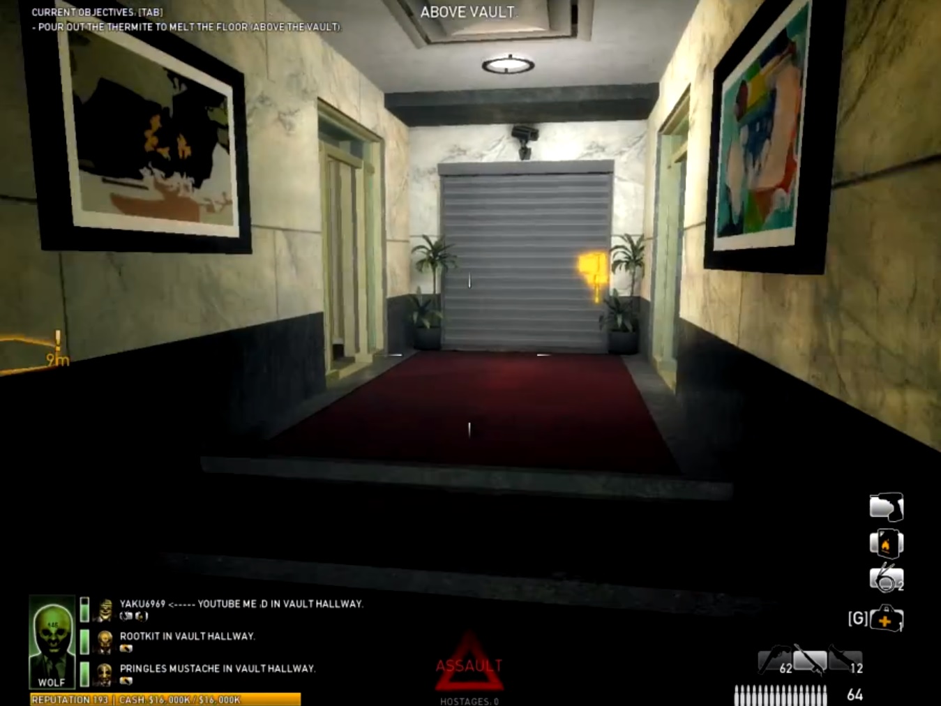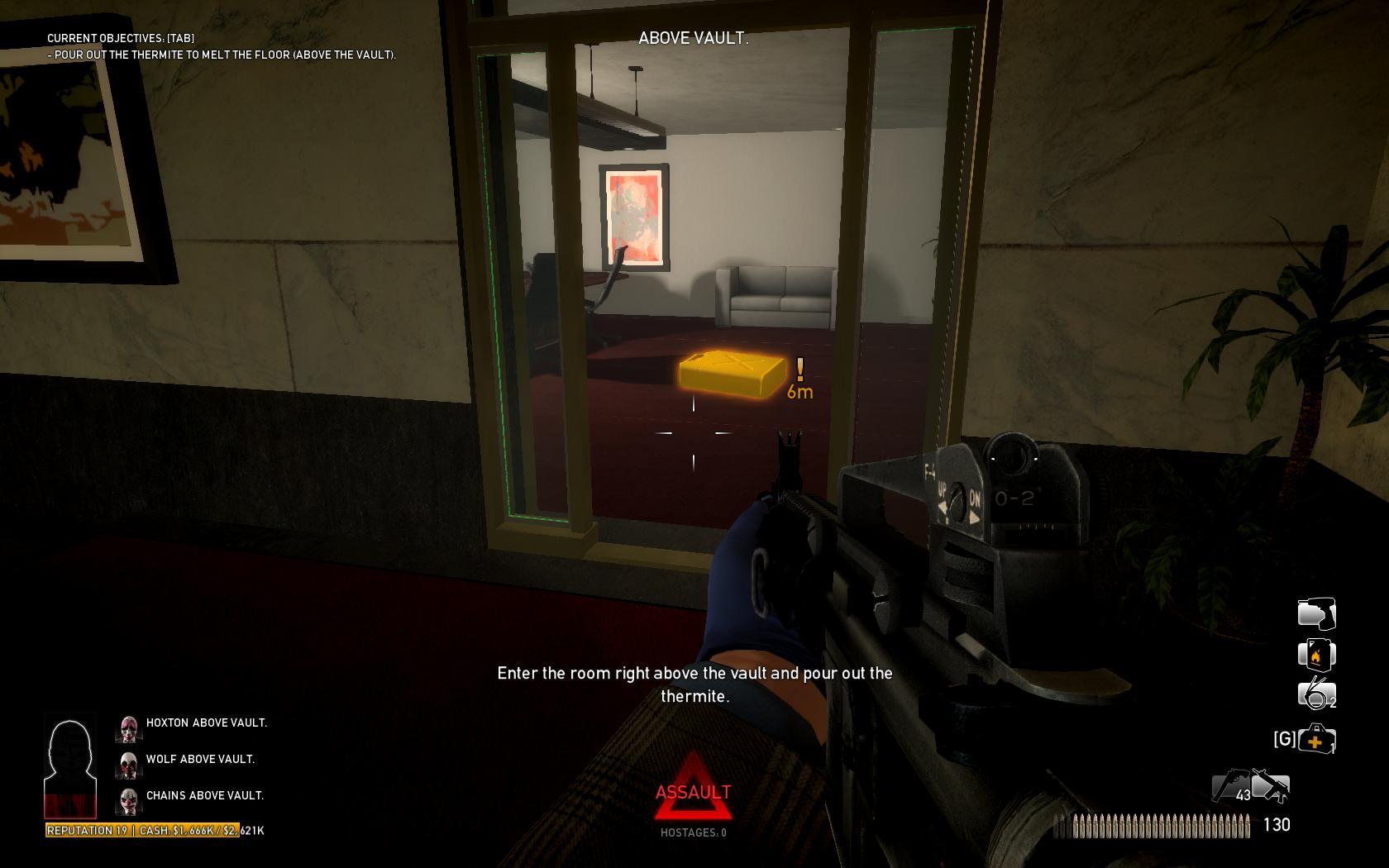 Defend the vault while the thermite burns the floor for a few minutes. Unless you're playing on Overkill 145+ difficulty, where Cloakers can come through the vents in the back, the closest enemy entry point is the elevators, so that room is a common area to hold out. Most of the enemies will come through the gate, but SWAT, Tasers and Cloakers can come through two of the elevator shafts during assaults. If you're close enough to a shaft, then you can hear the sound of an enemy rappelling down a few seconds before they reach your level. Since the enemies from the shaft must unhook themselves before attacking, you have time to kill them before they can inflict any damage. If you start to get overwhelmed, back off towards the security desk, which provides good cover, and it is common to have an ammo bag and doctor bag placed behind it.