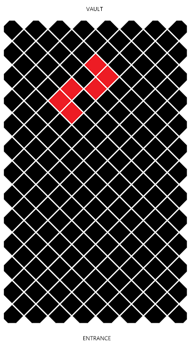 Once the drill is done, proceed through the secret door. In front of the Overvault, players must interact with the six correct tiles to open the Overvault (see image). Pushing the wrong tile would invalidate the entire run by causing the Overvault to be locked permanently and the hallway to be filled with poisonous yellow smoke.