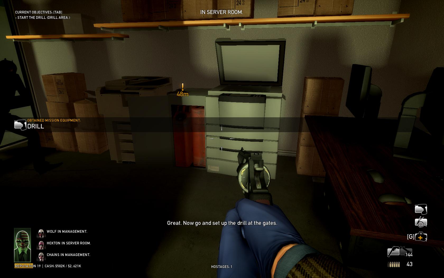 After you grab the drill, exit the server room, turn right, go straight, descend the stairs, and place the drill on the gate in the drill area. Someone should supervise the drill so that it's restarted soon after it jams, and beware of snipers through the high window on the side. The drill takes four minutes to complete, plus the amount of time during which it is jammed.