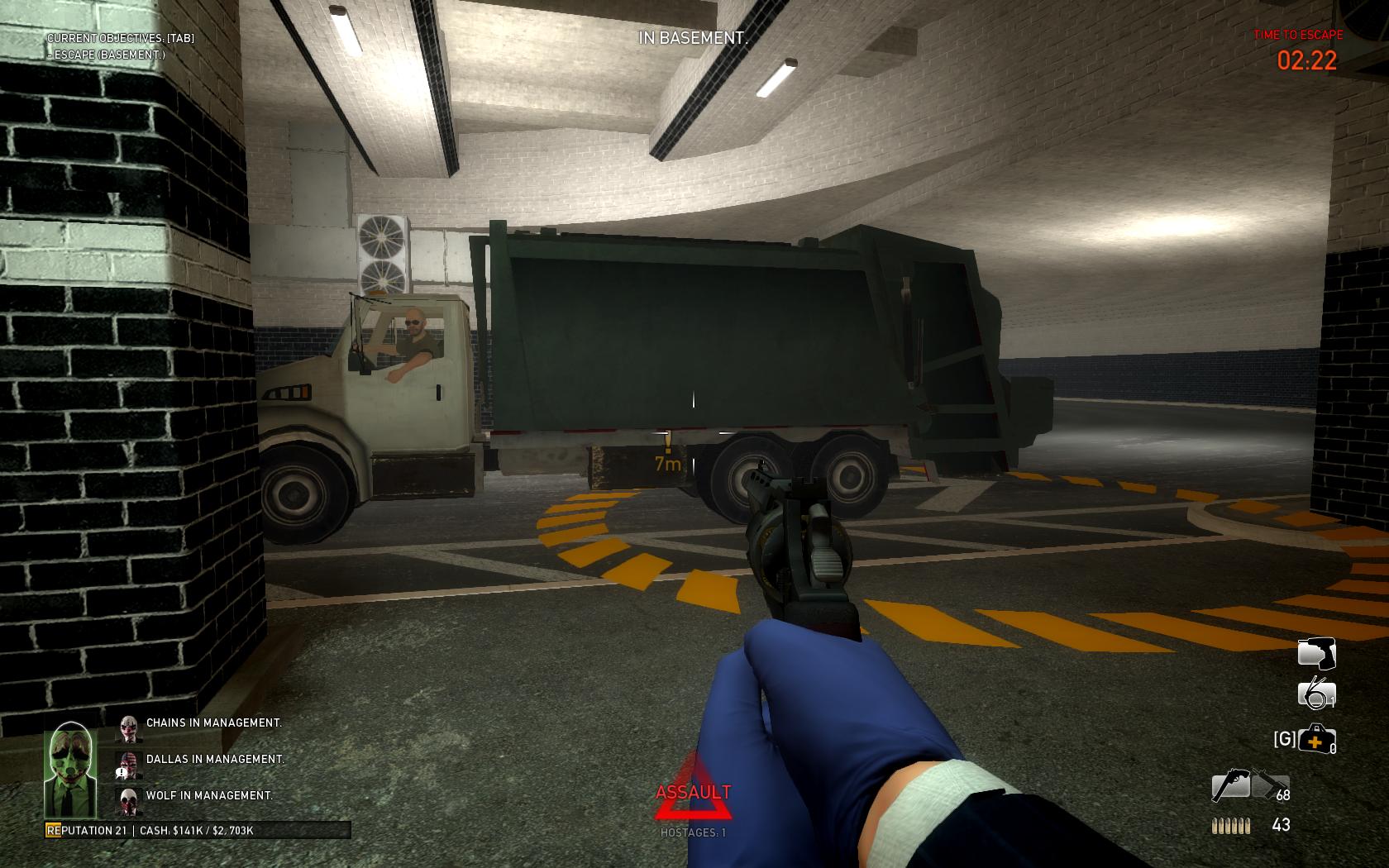 Jump through the hole, run through the bathrooms, turn right, and get into the first room. On higher difficulties, when you turn right out of the bathroom, there's a slight chance that there will be a Shield, either a Bulldozer or a Taser, and some heavy SWATs right in front of you. In the large office area, there will be a Bulldozer, two Tasers, a squad of Blue SWAT, or a squad of Cloakers waiting for you. You can run-and-gun past the Bulldozer and Blue SWAT, but you should always take down the Tasers or Cloakers. Use cover and get through the room as quickly as you can. SWATs and Tasers will rappel through the windows endlessly, which is nice if you're chasing a certain challenge, but not nice if you're trying to escape. Run to back of the room and go through the door. Watch out for civilians by the back desk and through the door (near the elevators). The four flights of stairs offer a moment to reload your weapons if you're running low. At the basement level, you'll see many doors. Keep in mind that it's completely random whether any of these doors open, but if they do, you'll have to deal with either a Bulldozer or a Taser. Stay on your toes when passing these doors and make sure your teammates are near in case you get downed. Move through the hallway until you reach the parking garage, where your getaway garbage truck will pull up to extract you. You may have a Bulldozer or group of Cloakers waiting in the basement where you extract, so when you walk through the last door before the garbage truck, check the corner to your left immediately after you enter, just in case.