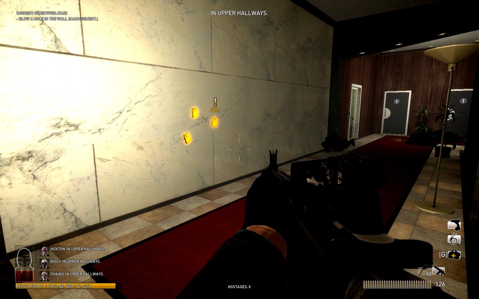 Near the beginning of the heist, run outside, place a trip mine on the center of the middle window of either the cafeteria or the drill area, and deactivate the mine before running back inside. Wait for the blue SWAT to plant C4 on the window with the mine; he can be easily recognized by his movement behavior. Unlike other law enforcers, who run past the windows to reach the lobby, he will hug the exterior wall and approach the center window of either wing. As soon as he is in front of your mine, activate it. Trip mines can be activated through the glass as long as your crosshair over them and you are close enough.