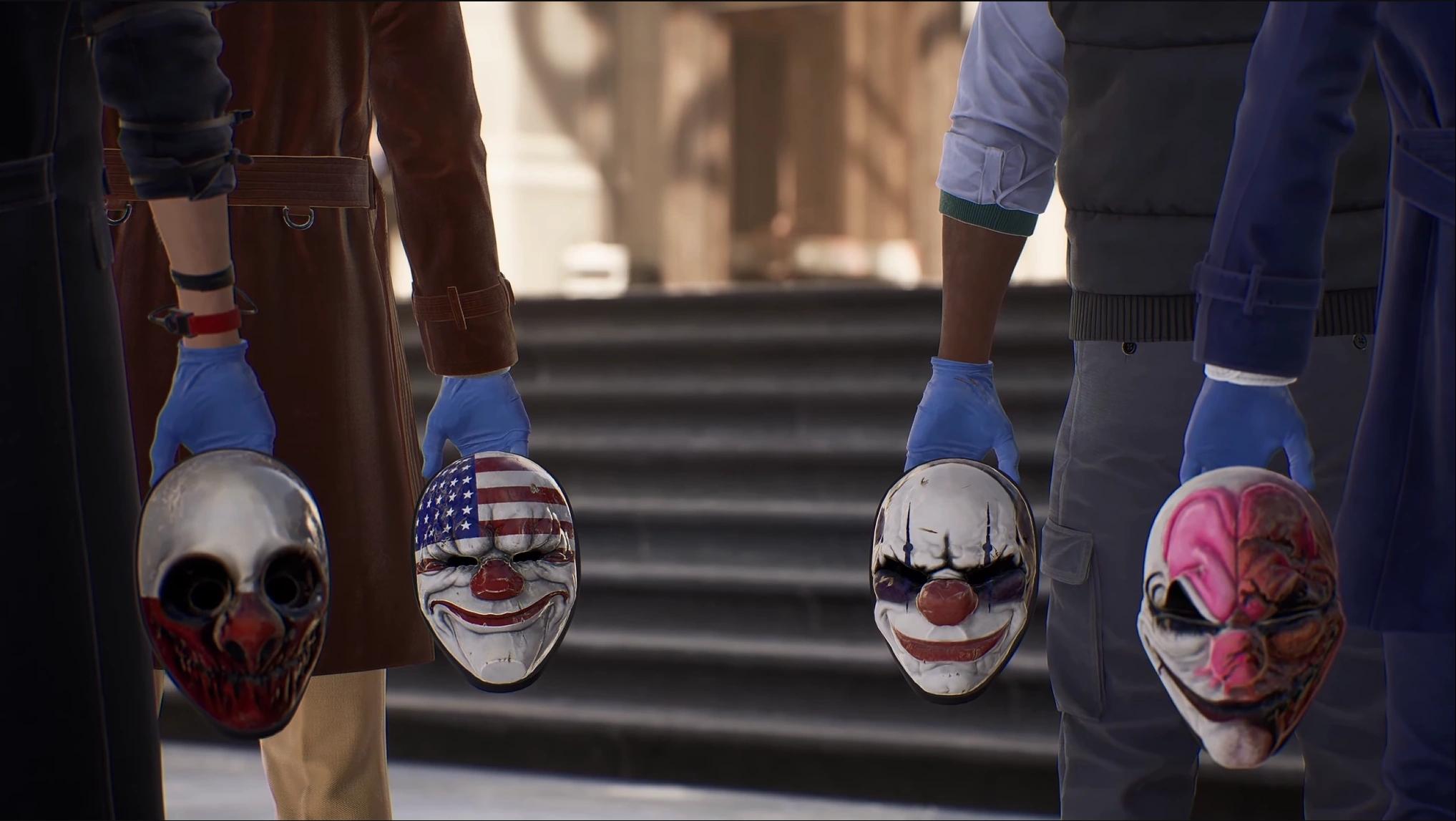 The original four Payday gang members holding their masks, as seen in the trailer.