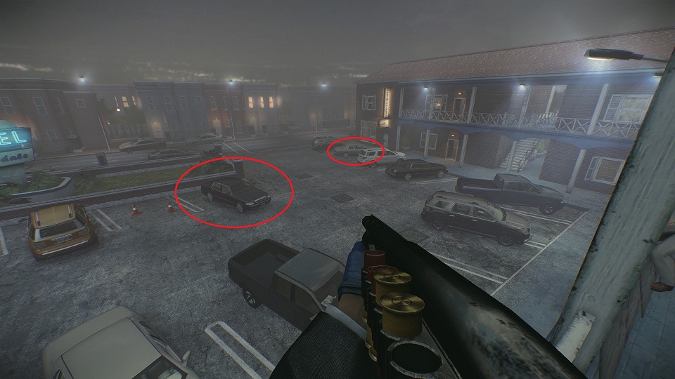 Spawning in the street, the crew must first kill several mobsters located around the motel, who will flee into hotel rooms, boarding the windows behind them. Visible claymore mines spawn on numerous hotel doors, and must be avoided or detonated to prevent player damage.