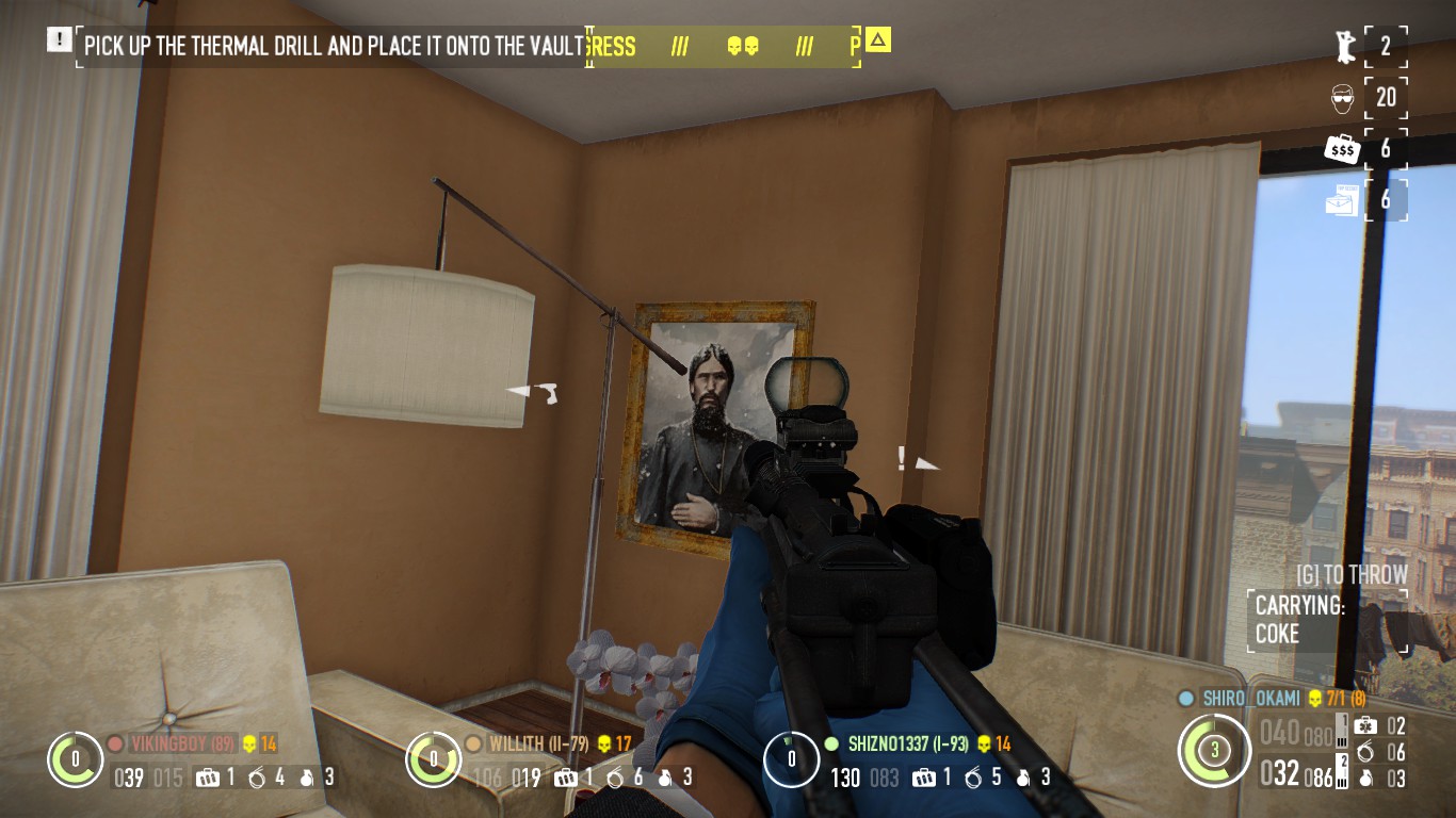 Once the crew reaches the penthouse, the main doors must be breached with C4. The Commissar will always seal himself inside his personal vault, forcing the crew to drill it open; Bile soon drops a thermal drill, that must be set-up and defended for around four to six minutes. During this assault, a gunship owned by the Commissar will occasionally fire on the penthouse, firing rockets into the room and setting it ablaze. The shots from the gunship will instantly stop the drill. After three strikes, a valve wheel can be turned to activate the sprinklers. The fire will take several seconds to extinguish.