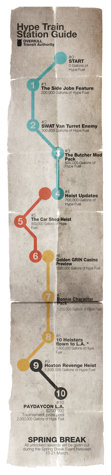 The Hype Train was a community event for PAYDAY 2, taking place from the 5th of February to the 12th of March 2015. Like CrimeFest, The Hype Train was highly anticipated for its promise of new content, gameplay features and rewards. The Hype Train event is named and themed after the Hype Train internet slang.