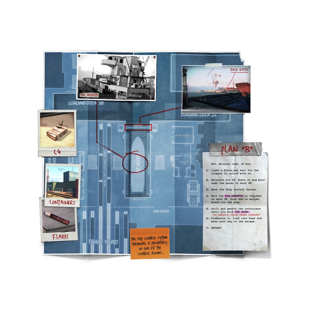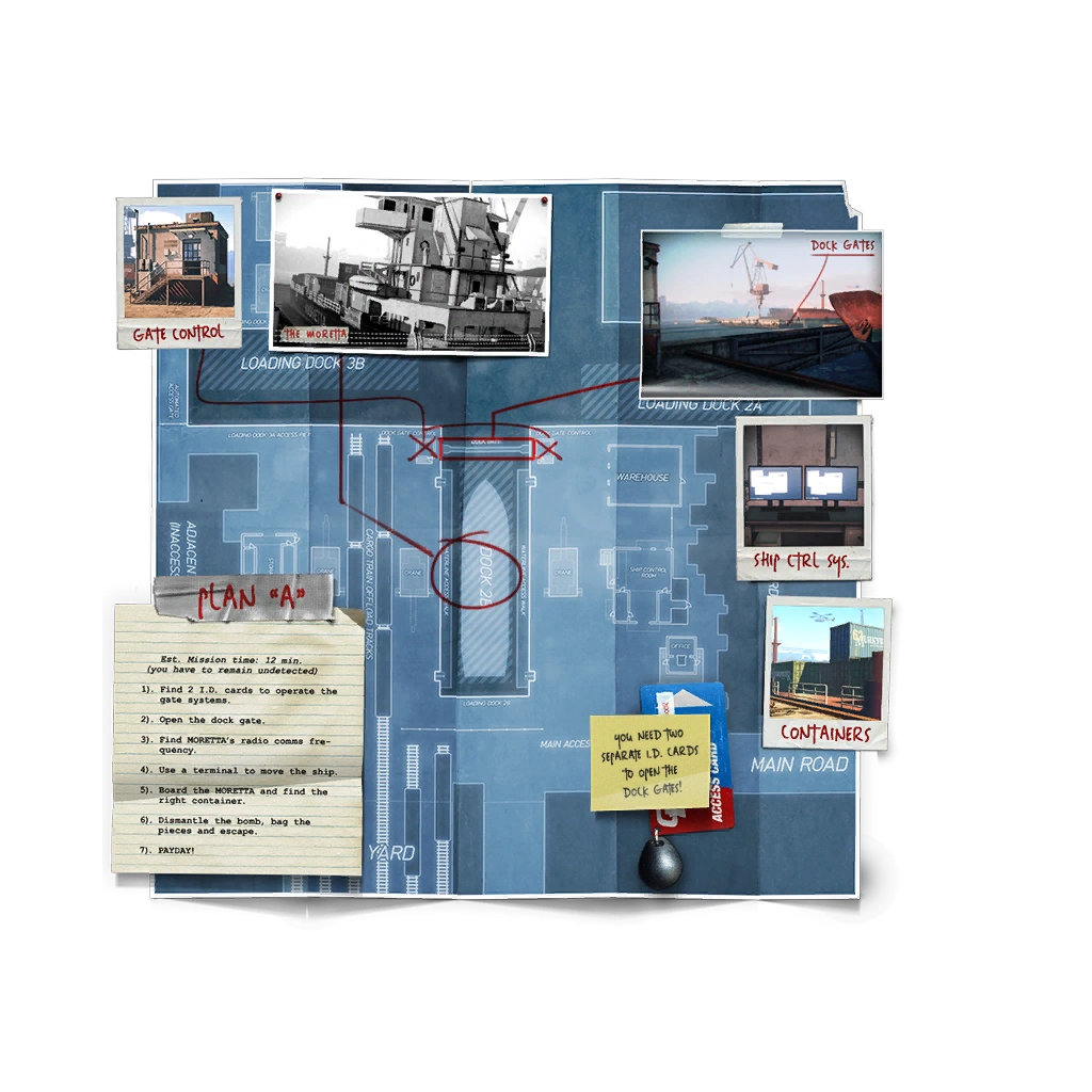 Preplanning once again provides a wealth of options and flexibility in Dockyard, with some all-new assets available for use. In this heist, the crew is restricted to a maximum of 10 favours for preplanning. The number of favours does not scale with difficulty.