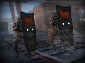 U.S. Marshal Shields are "upgraded" Shields introduced in the Lost In Transit heist that brandish futuristic shields and Deagle pistols. In addition, they have the ability to blind a heister with their shields should they get too close. However, their shields are notably much more fragile than a regular Shield's, and can be destroyed by conventional weaponry. Should this happen, they get knocked down only to get back in the fight with a much more powerful VD-12 shotgun.
